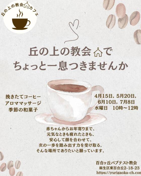 百合ヶ丘バプテスト教会では、月1回水曜日の午前中にカフェをオープンしています!